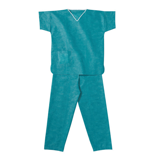 Egyszer használatos zsilipruha, zöld, tunika és nadrág egybecsomagolva. A tunika zsebekkel ellátott, V nyakkivágással. A nadrág derékmegkötôvel rendelkezik.