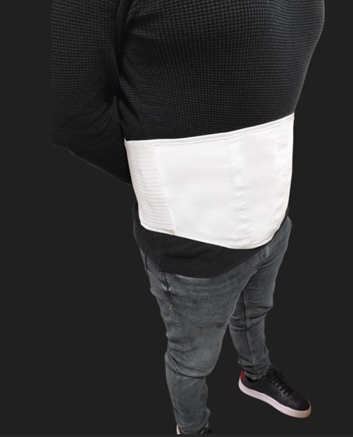 A tépőzár kinyitása után, a sérvkötő vászon részét helyezzük a hasra, majd a beteg bal oldalán a tépőzár segítségével rögzítsük!