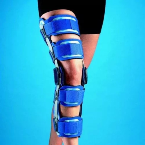 A térd természetes mozgását követő, szabályozható mozgásterjedelmű sínezettel ellátott térdrögzítő, amely nagyfokú térdízületi instabilitás, kereszt- vagy oldalszalag sérülések