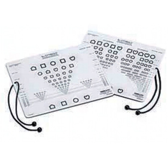 >- arányosan elosztott (logMAR) egyenletes távolságra lévő vonalak vannak az első oldalon