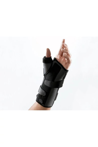 Alakítható alumíniummerevítők teszik lehetővé a hüvelykujj pihentetését, míg a csukló mozgását szabadon fenntartják. Tépőzáras rögzítő pánt. Röntgensugár áteresztő a merevítők. Megfelelő kényelmet biztosító szellőző, habszivaccsal bélelt anyagból. Langyos vízzel mosható. Kiterítve szárítsuk!