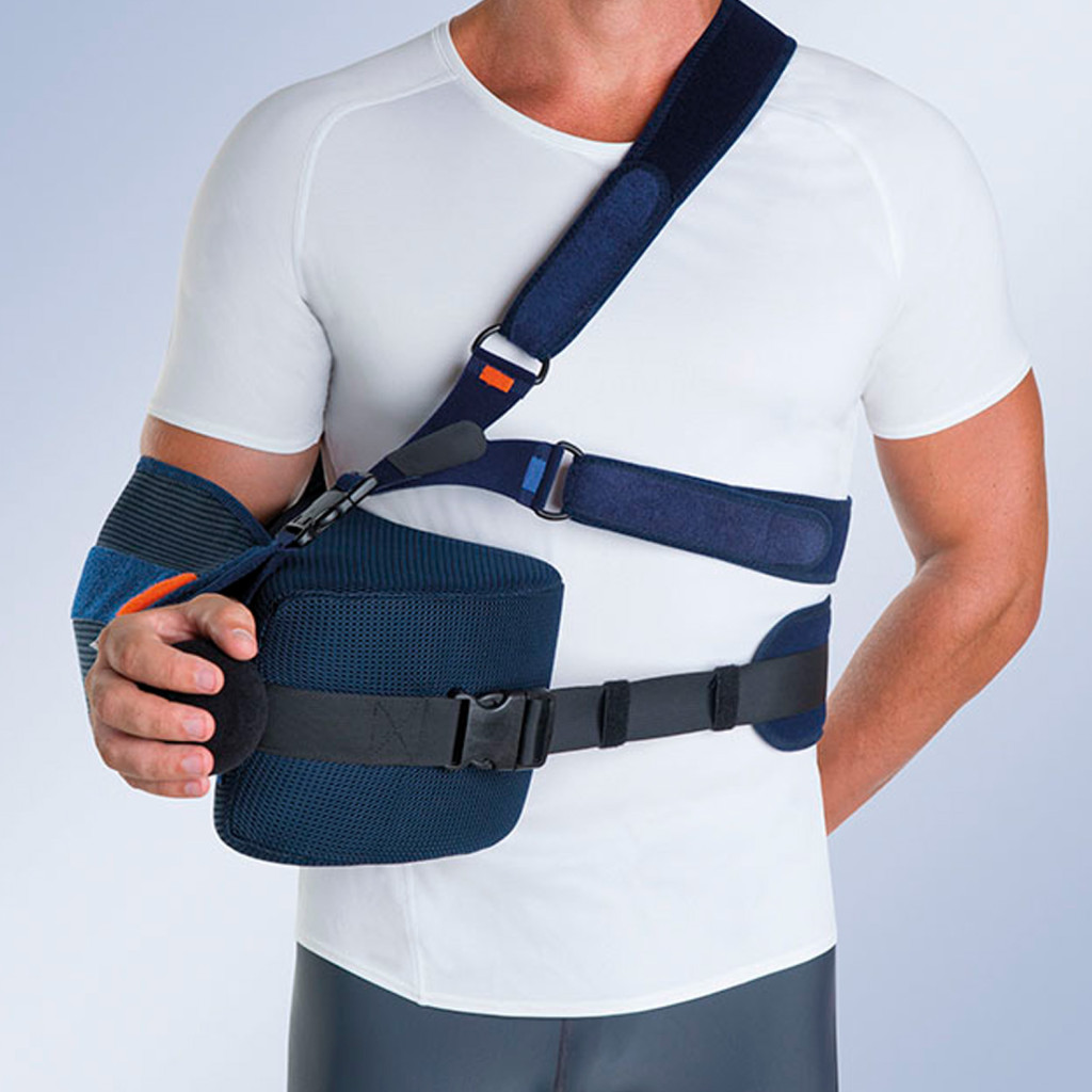 >A váll és a kar immobilizálása 90°-os külső elforgatással, 15°-os vagy 30°-os vállakrablás mellett.