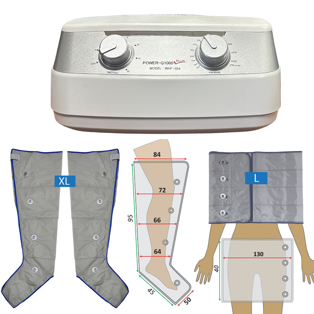 Ár tartalma: Power Q-1000 Plus készülék (1db); Láb mandzsetta: XL méret (1pár, azaz 2 lábra); Öv mandzsetta: L méret légtömlő (1db); Légtömlő: 4 elvezetéses (1db); 2x4 elvezetéses (1db), elosztó (1db).